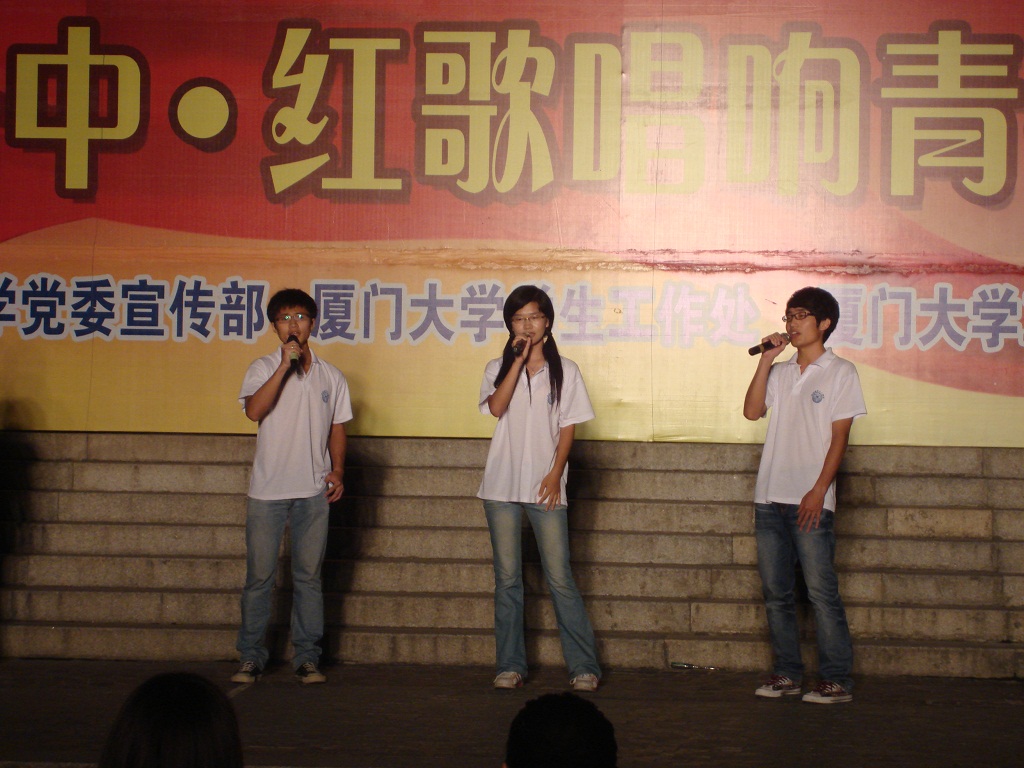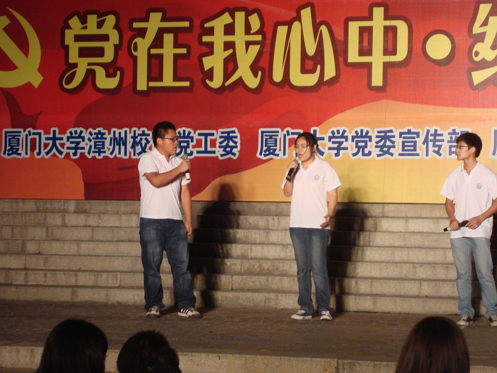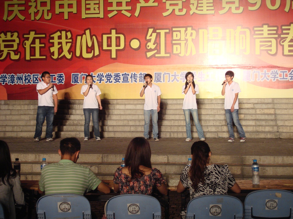 6月23日晚7时,在漳州校区北区步行广场“党在我心中”小组唱红歌(B组)比赛开始了激烈角逐。09级刘佳乐、10级江艾婧、郑鹊、张新栋、张信骁5名同学代表我院参赛。