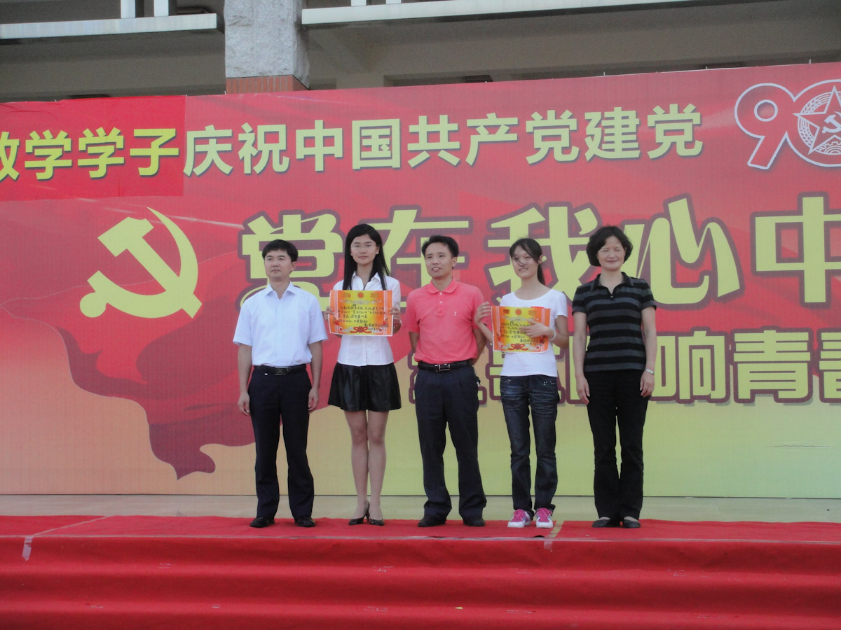 党委书记张明智(左一)、团委副书记杨机像(左三)、10级基地班班主任宣飞红(右一)为第一名颁奖