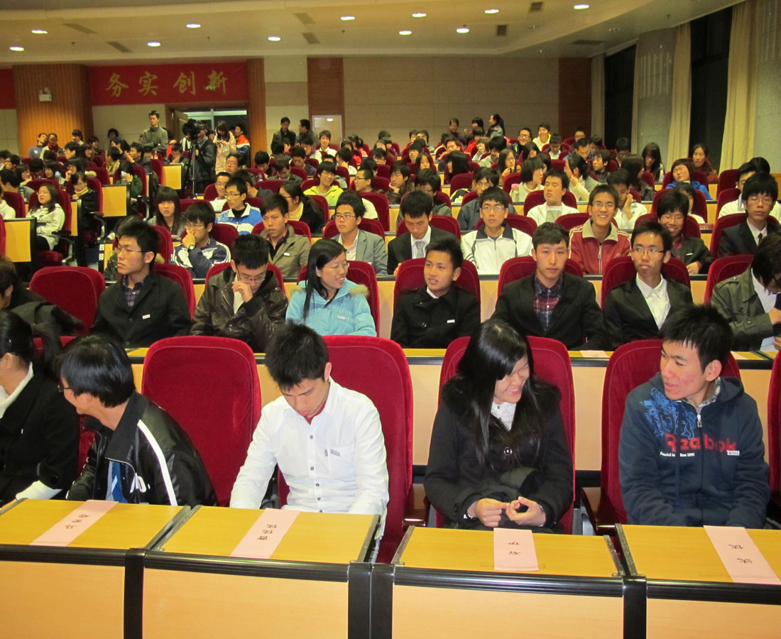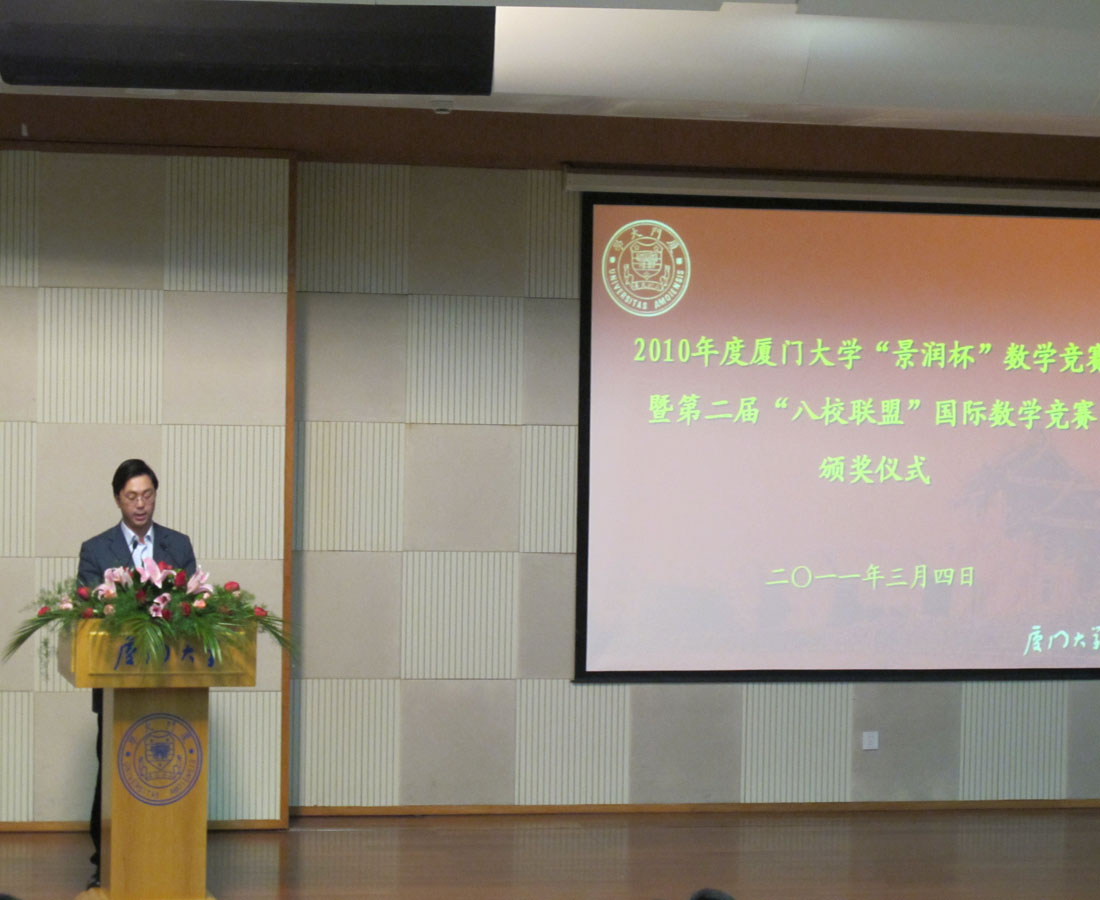 2011年3月4日晚上7点,2010年度厦门大学“景润杯”数学竞赛暨第二届“八校联盟”国际数学竞赛颁奖仪式在厦门大学漳州校区小报告厅举行。到场的领导有厦门大学副校长邬大光、厦门大学校长助理王巧萍、国际处处长毛通文、漳州校区管委会副主任黄田、经济乐竞体育-中国一站式服务官网党委副书记王艺宏、信息科学与技术乐竞体育-中国一站式服务官网党委副书记李芬芬、我院院长林亚南、副院长邱春晖、公共数学教学部主任林建华等。107名获奖学生及09、10级学生代表参加了此次颁奖典礼。