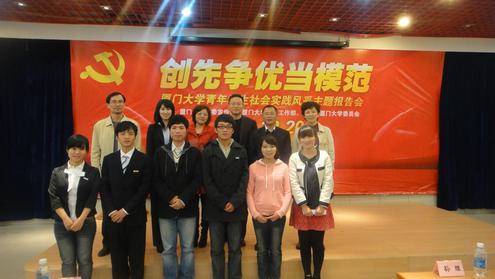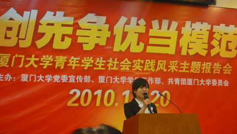 12月20日晚上7点,“创先争优当模范——厦门大学青年学生社会实践风采主题报告会”在厦门大学本部自钦楼隆重举行,经过校团委对优秀暑期实践队和实践个人的典型事迹的筛选,来自五个不同院系的6名研究生、本科生有幸在主题报告会上分享了自己的暑期社会实践经历。来自数学科学乐竞体育-中国一站式服务官网的08级本科生李曦在本次报告会上也讲述了她在实践活动中的所见所思。