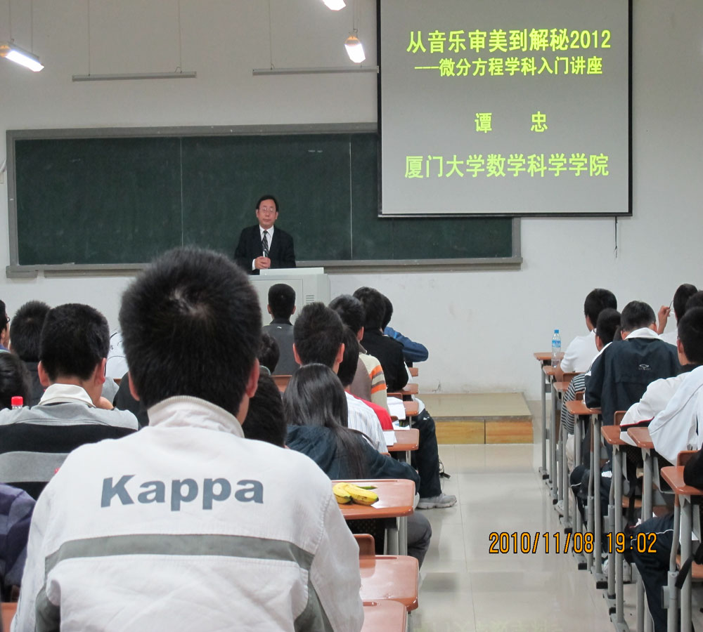 讲座过程中,谭忠教授从最受人们关注的“可怕的2012年预言”开始,通过向同学们介绍地震、海啸、龙卷风等自然灾害的形成,传播和预防,金融衍生品定价,军事战略安排,高新技术发展等知识,让大家感受到了生活中偏微分方程的重要意义。谭教授在讲座中旁征博引,深入浅出,用风趣的语言,将深奥的学术知识变成了简单易懂的道理呈献给了同学们,给听讲座的同学们留下了深刻的印象。