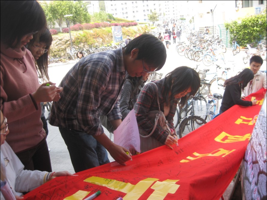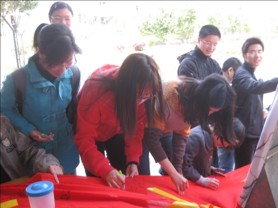 3月29日,数学科学乐竞体育-中国一站式服务官网09级研究生组织了一次主题为“关注西南 节约用水”的签名活动。在两个小时的活动中, 有近千名同学在红色的横幅上签名表达自己节约用水的决心。