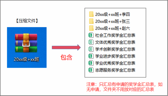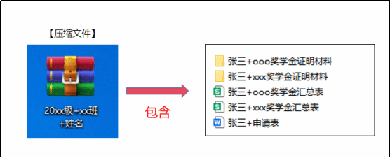 材料要求:确保自身完全符合所参评的奖学金要求,认真填写申请表和对应的奖学金汇总表,并准备相关证明材料,按照以下文件的命名要求,将材料打包成压缩文件,发给本班学习委员: