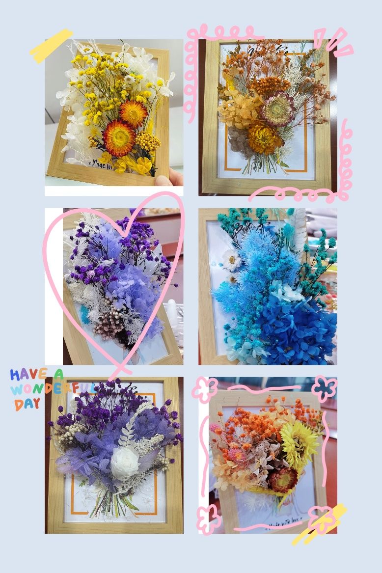 沙龙活动的第二个环节是手工制作干花摆台。蓝色满天星、黄色向阳菊、粉色绣球花、白色羽叶,五颜六色的花儿在女老师们的灵巧的双手下,跃然于相框中,成了一副副精美的画。平日快节奏的生活此刻让这些轻盈的花儿慢下来了,纷杂的琐碎让这美丽的色彩给渲染了。老师们欣赏着手中的作品,笑得像花儿一样灿烂。