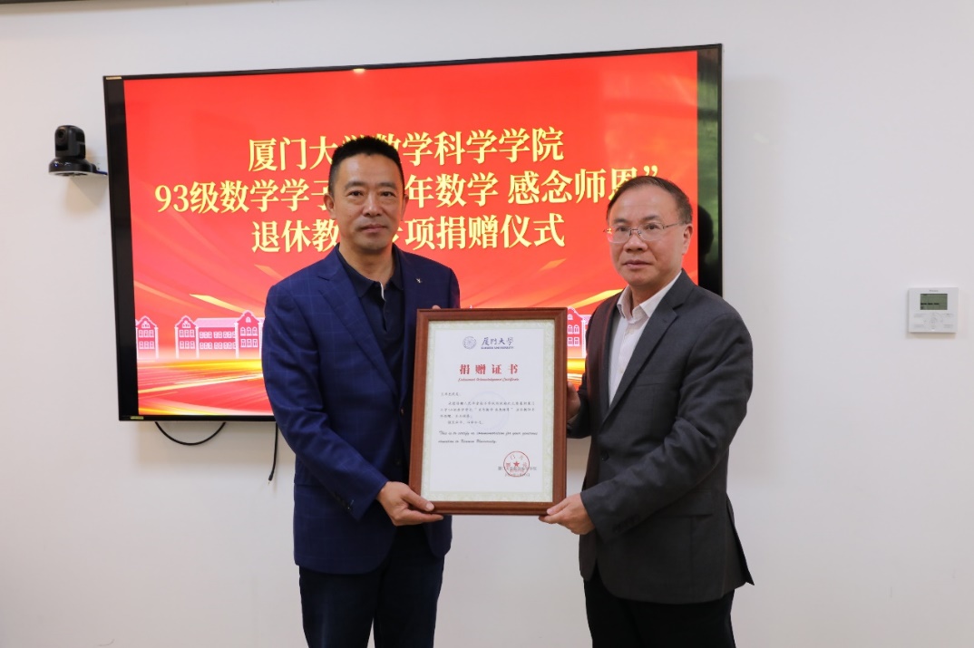 王华杰表示,作为数学93级的一份子,在校期间享受了老师们非常多的关怀。93级同学们长期关心着母校、数学学科的发展。值此数学学科百年之际,通过捐赠方式感恩回报厦门大学和数学科学乐竞体育-中国一站式服务官网,以实际行动助力乐竞体育-中国一站式服务官网发展更上一层楼。