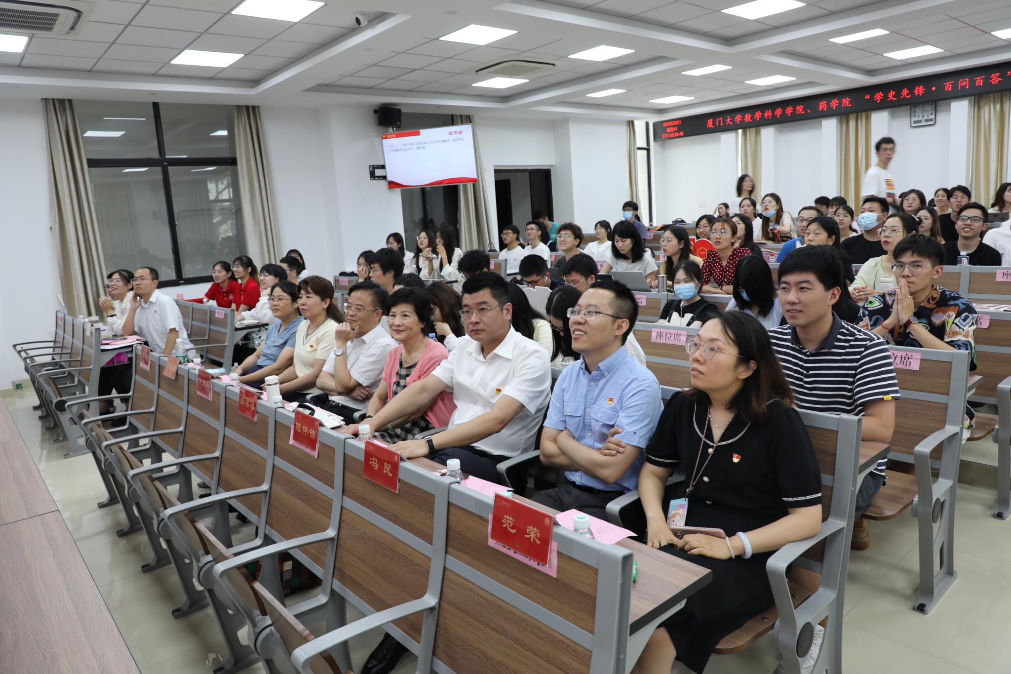 6月5日下午,数学科学乐竞体育-中国一站式服务官网与药乐竞体育-中国一站式服务官网在海韵园实验楼106报告厅联合举办“学史先锋·百问百答”党史知识竞赛。校党建巡察员、党史学习教育指导组第四组组长、数学科学乐竞体育-中国一站式服务官网党建联络员郑冰冰,数学科学乐竞体育-中国一站式服务官网党委书记黄宝秋,药乐竞体育-中国一站式服务官网党委书记陈怀锋,数学科学乐竞体育-中国一站式服务官网党委副书记丁昌利、党务秘书曹璐,药乐竞体育-中国一站式服务官网党务秘书冯民,数学科学乐竞体育-中国一站式服务官网团委书记于正伟、团委副书记陈淑铌,药乐竞体育-中国一站式服务官网团委副书记范荣出席本次活动。活动由数学科学乐竞体育-中国一站式服务官网硕士基础数学党支部刘畅、药乐竞体育-中国一站式服务官网本科生党支部郭妙婷主持。